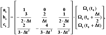 (в данном случае) системы координат, т.е. Здесь Wа - абсолютная угловая скорость вращения связанного трехгранника, UE, UI - отображения вектора угловой скорости вращения Земли соответственно на оси приборного базиса Е и геоцентрического базиса I. Будем считать, что угловая скорость W(t) изменяется по закону: на интервале от to до to+Dt. Для получения решения уравнения (3) можно использовать разложение в ряд Тейлора. Тогда вектор конечного поворота будет вычисляться по формуле: Коэффициенты a, b, c находятся из уравнения (4) по формуле: где i = x,y,z ( x,y,z - оси координат навигационной системы, в данном случае - геоцентрической). Снимая с блока гироскопов измерения абсолютной угловой скорости в n точках (в 3-х), находим получаем значение вектора конечного поворота и вычисляем кватернион на шаге решения: где Текущее значение кватерниона ориентации находим из выражения Затем пересчитываем вектор кажущегося ускорения, измеряемый блоком акселерометров, на оси геоцентрической системы координат: Алгоритм ориентации для случая географической системы координат строится аналогично, только вместо L рассматривается кватернион определяющий ориентацию БЧЭ относительно географической системы координат: а выражение для W будет иметь вид: вычислив А,