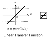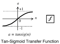 входной слой. Сети прямого распространения – наиболее простой и наглядный способ объединения нейронов. Он позволяет сделать работу нейронной сети логически прозрачной и, в некоторых случаях, позволяет осуществлять анализ исследуемой информации в алгоритмическом виде. Обе используемые нейронные сети являются двухслойными сетями прямого распространения. Скрытый слой состоит из нейронов с передаточной функцией тангенциальной сигмоиды. Достоинством этой функции является автоматический контроль усиления: для слабых сигналов, когда величина aj близка к нулю, кривая вход-выход имеет сильный наклон, дающий большое усиление. Когда величина сигнала внутреннего возбуждения становится большей по модулю, усиление снижается. Таким образом, большие по величине сигналы воспринимаются сетью без насыщения, а слабые проходят без чрезмерного ослабления. Выходной слой состоит из линейных нейронов. Это обусловлено тем, что если в выходном слое использовать также сигмоидные нейроны, то выходные значения будут лежать в интервале от -1 до +1. Такая двухслойная топология была выбрана из-за того, что сеть, состоящая из скрытого уровня с тангенциальными нейронами и выходного слоя с линейными нейронами, позволяет аппроксимировать любую линейную и нелинейную функции, используя при этом произвольное число нейронов скрытого уровня.